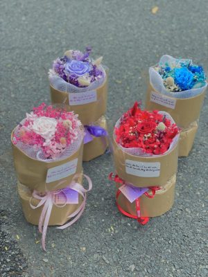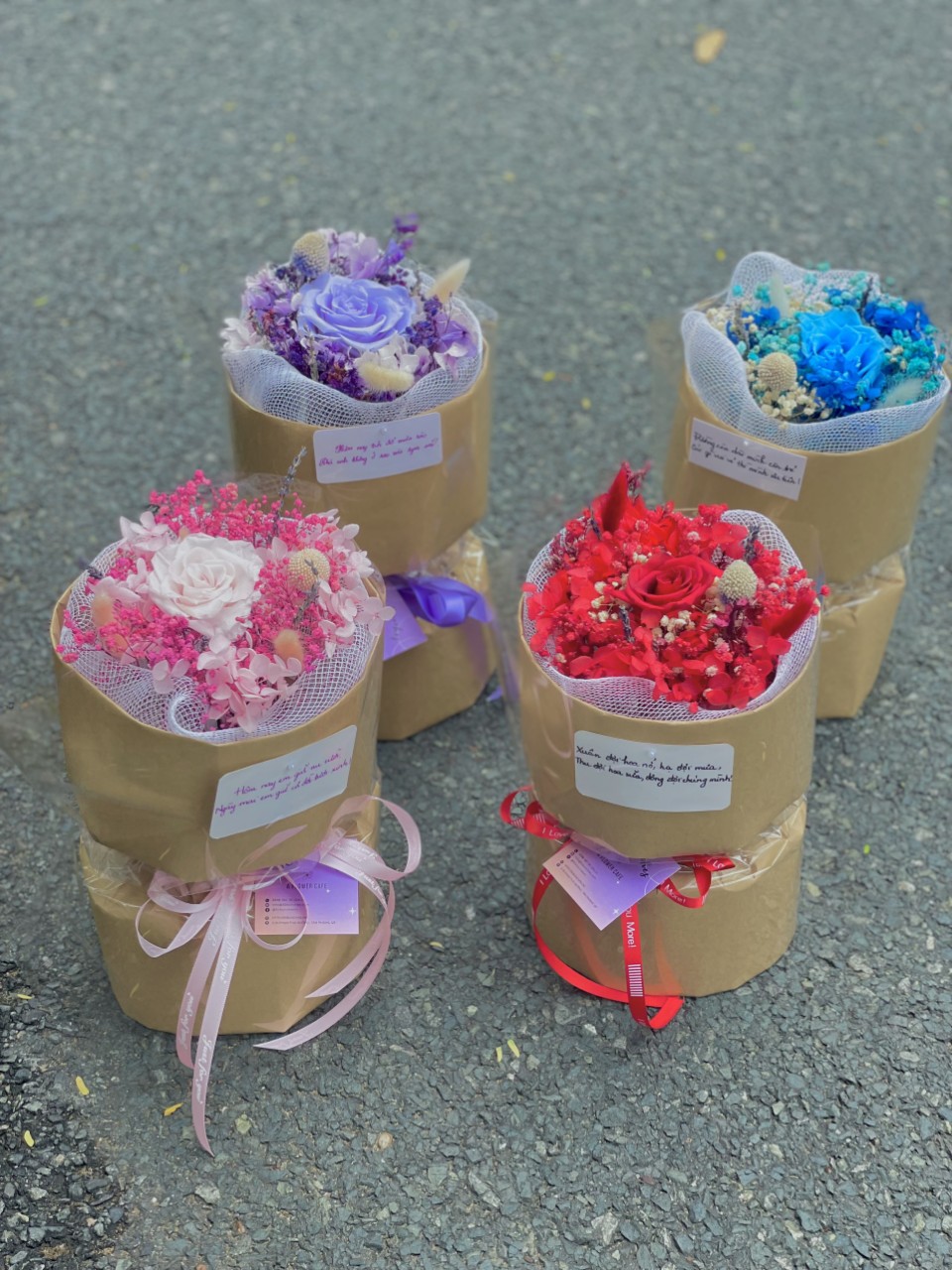 Bó hoa khô Moonlit bao gồm hoa hồng khô vĩnh cửu, tú cầu, cầu may và các loại hoa khô điểm khác.